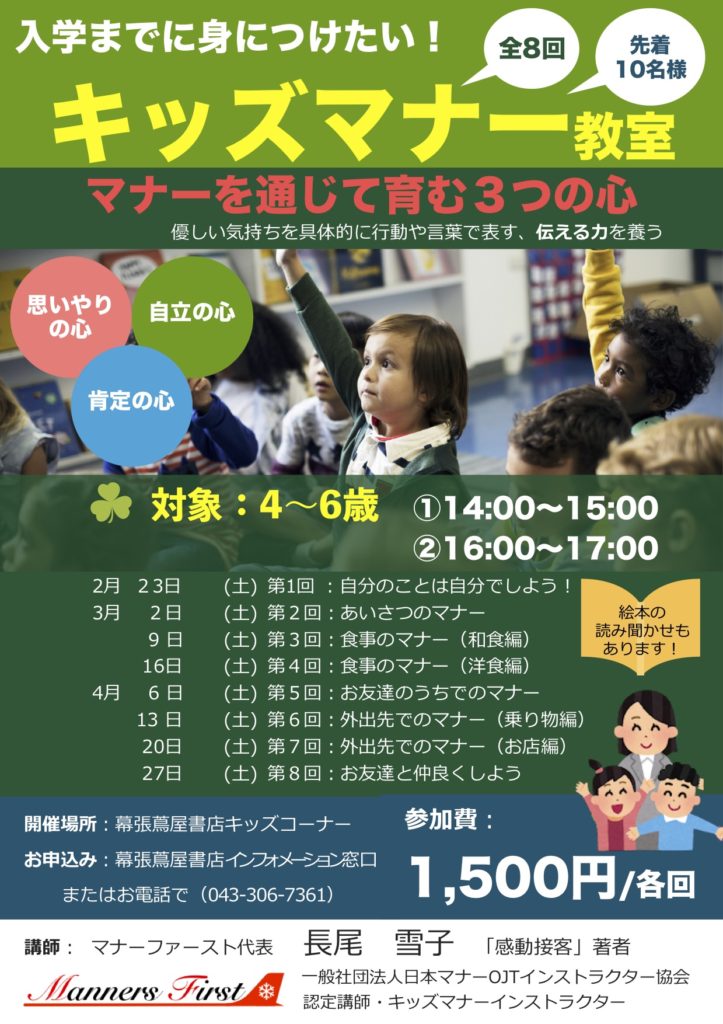 キッズマナー教室を開講いたします。読み聞かせも行います!幕張新都心AEON内、蔦屋書店にぜひお越しください。就学前のお子様にいかがでしょうか。